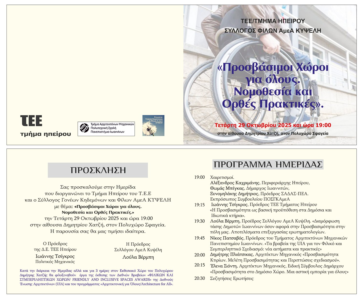 Η εκδήλωση αποτελεί συνέχεια της κοινής πρωτοβουλίας που ανέπτυξαν το Τμήμα Ηπείρου του ΤΕΕ και ο Σύλλογος Γονέων , Κηδεμόνων και Φίλων ΑμεΑ Κυψέλη, προκειμένου να επιτύχουμε στην πόλη μας, και όχι μόνο, Προσβάσιμους Χώρους για Όλους.