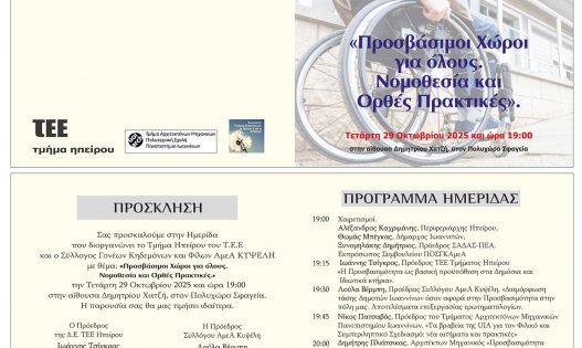 Το ΤΕΕ τμήμα Ηπείρου, ο Σύλλογος Γονέων, Κηδεμόνων και Φίλων ΑμεΑ Κυψέλη, ο Δήμος Ιωαννιτών, η Αρχιτεκτονική Σχολή του Πανεπιστημίου Ιωαννιτών, ο ΣΑΔΑΣ – ΠΕΑ, Σύλλογος Αρχιτεκτόνων Διπλωματούχων Ανωτάτων Σχολών διοργανώνουν Ημερίδα με τίτλο: «Προσβάσιμοι Χώροι για όλους. Νομοθεσία και Ορθές Πρακτικές» στον Πολυχώρο στα Σφαγεία Δ.Χατζής, 29 Οκτωβρίου ημέρα Τετάρτη ώρα προσέλευσης 18:45.